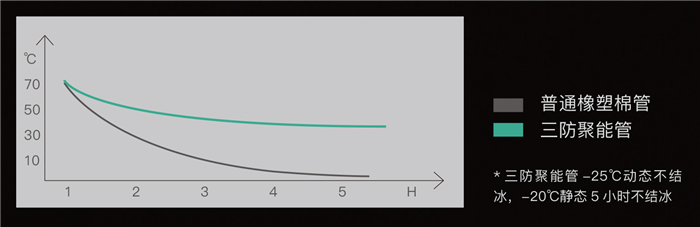 保溫層采用新型 PE 閉孔發泡材料,導熱系數低至0.028W/ (m-K),在低溫環境下,可有效減少熱損失,延長熱水冷卻時間;