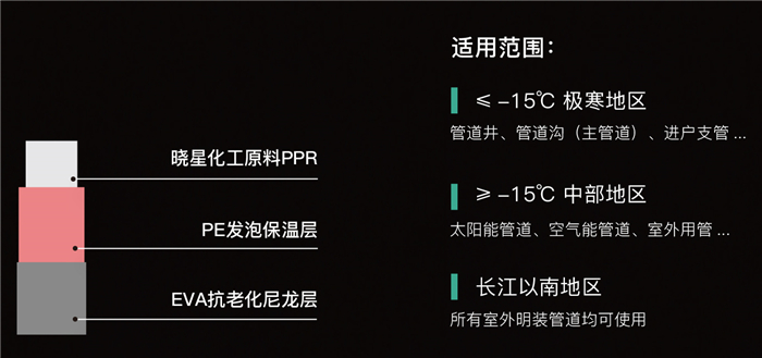 管材采用曉星原料顆粒,質量可靠。外護層采用自主研發 EVA 抗老化尼龍層,耐候抗刮擦抗老化,有效保護保溫層及內管。